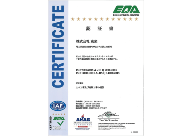 平成27年、国際品質管理システム規格「ISO9001」、国際環境管理システム規格「ISO14001」を取得。