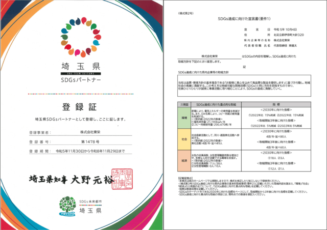 SDGsの取り組みを自ら実施、公表する県内企業・団体等を埼玉県が登録する「埼玉県SDGsパートナー」に当社は令和5年に登録。