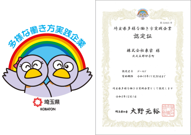 埼玉県が推進する「多様な働き方実践企業」として、「ゴールド」ランク認定。