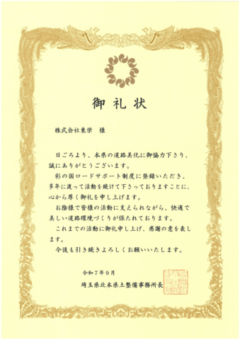 彩の国ロードサポート制度の一環として、当社では定期的に地域の道路清掃・美化活動に取り組んでいます。この度、その活動に対して、埼玉県北本県土整備事務所より御礼状を頂戴しました。