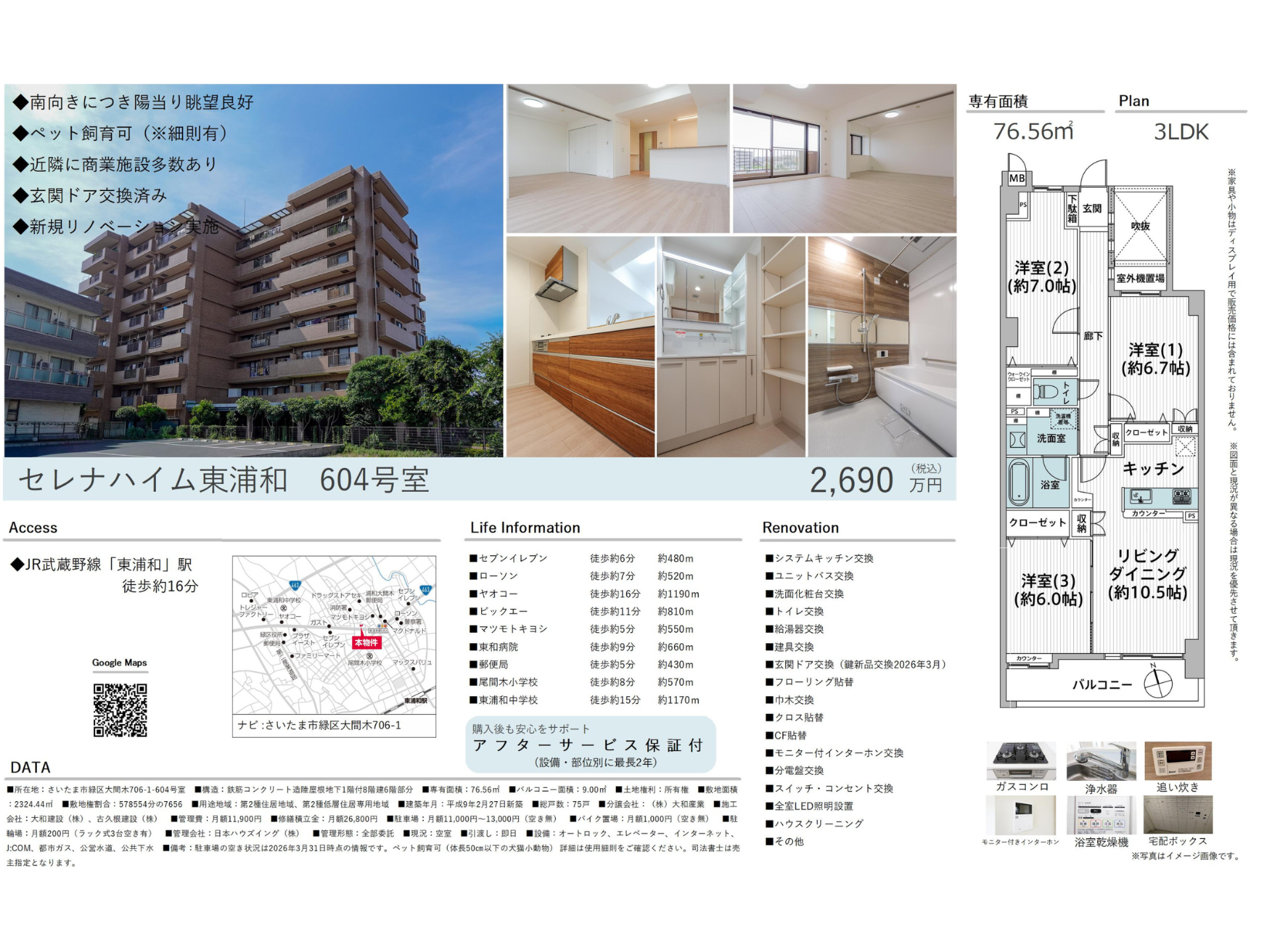 〇南向きにつき陽当り眺望良好 〇ペット飼育可(細則あり) 〇近隣に商業施設多数あり 〇玄関ドア交換済み 〇新規リノベーション