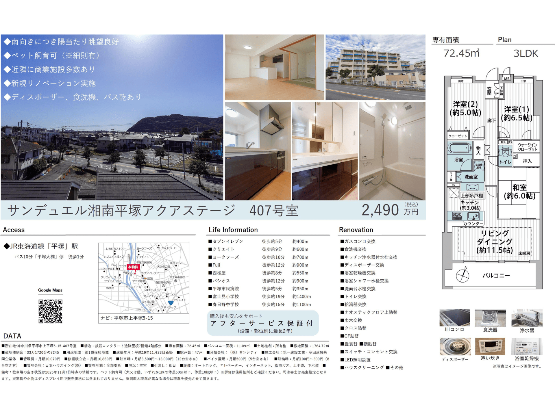 〇南向きにつき陽当たり眺望良好 〇ペット飼育可(※細則あり) 〇近隣に商業施設多数あり 〇新規リノベーション実施 〇ディスポーザー、食洗機、バス乾あり